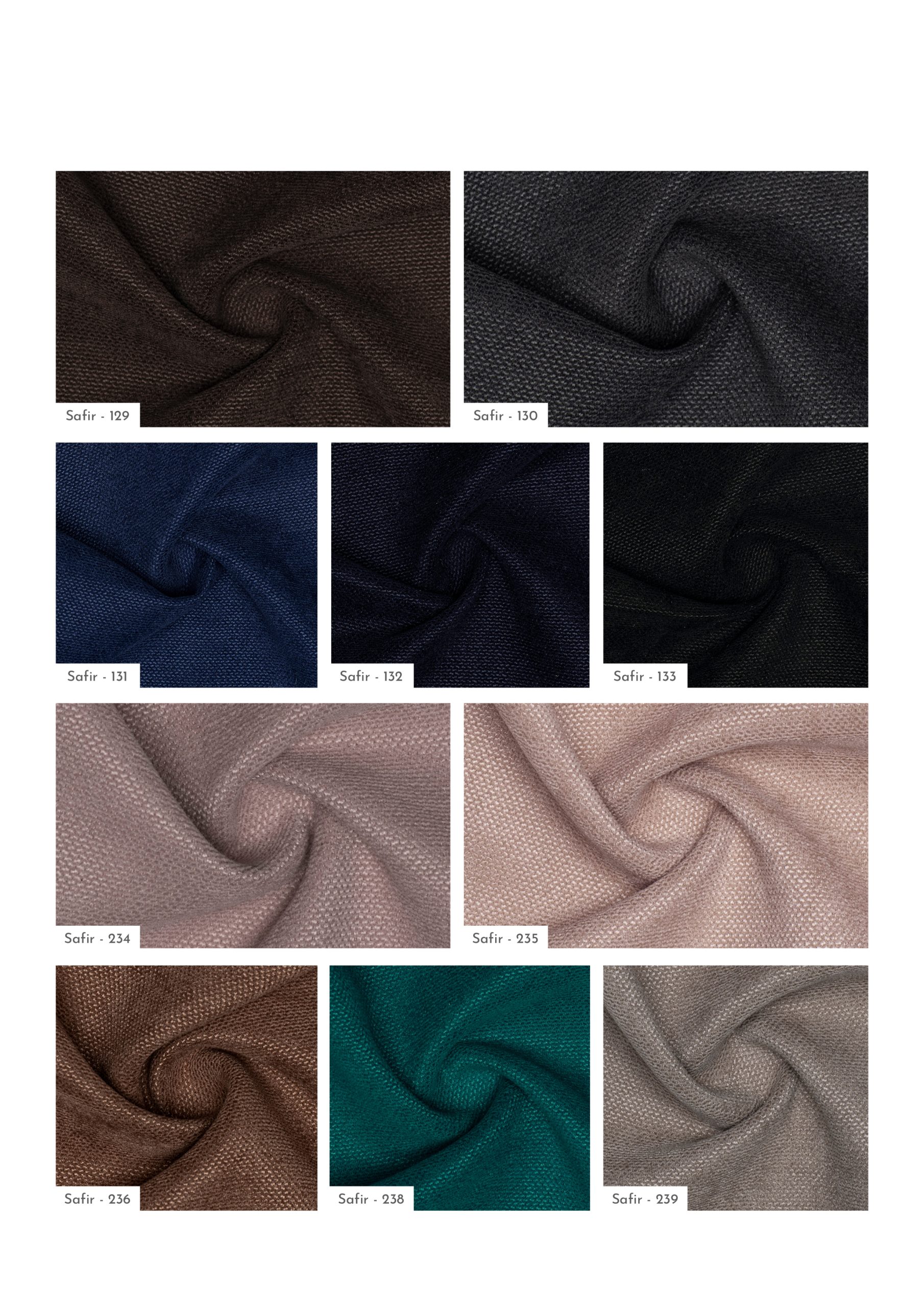 The SAFIR curtain fabric, with its velvety appearance that flows softly in pleats, embodies a refined lifestyle. It is a modernized variant of the classic velvet fabric, made from ultra-fine densely woven polyes- ter yarn and a sanding process after weaving to maintain its original appearance with each wash. The slightly fuzzy appearance obtained after the sanding process reinforces this look.